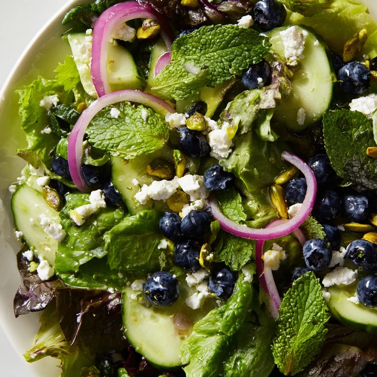 This vibrant spring salad brings together the natural sweetness of fresh blueberries with the satisfying crunch of roughly chopped pistachios. A bed of tender spring mix provides the perfect foundation, while crumbled feta adds a creamy, tangy contrast.