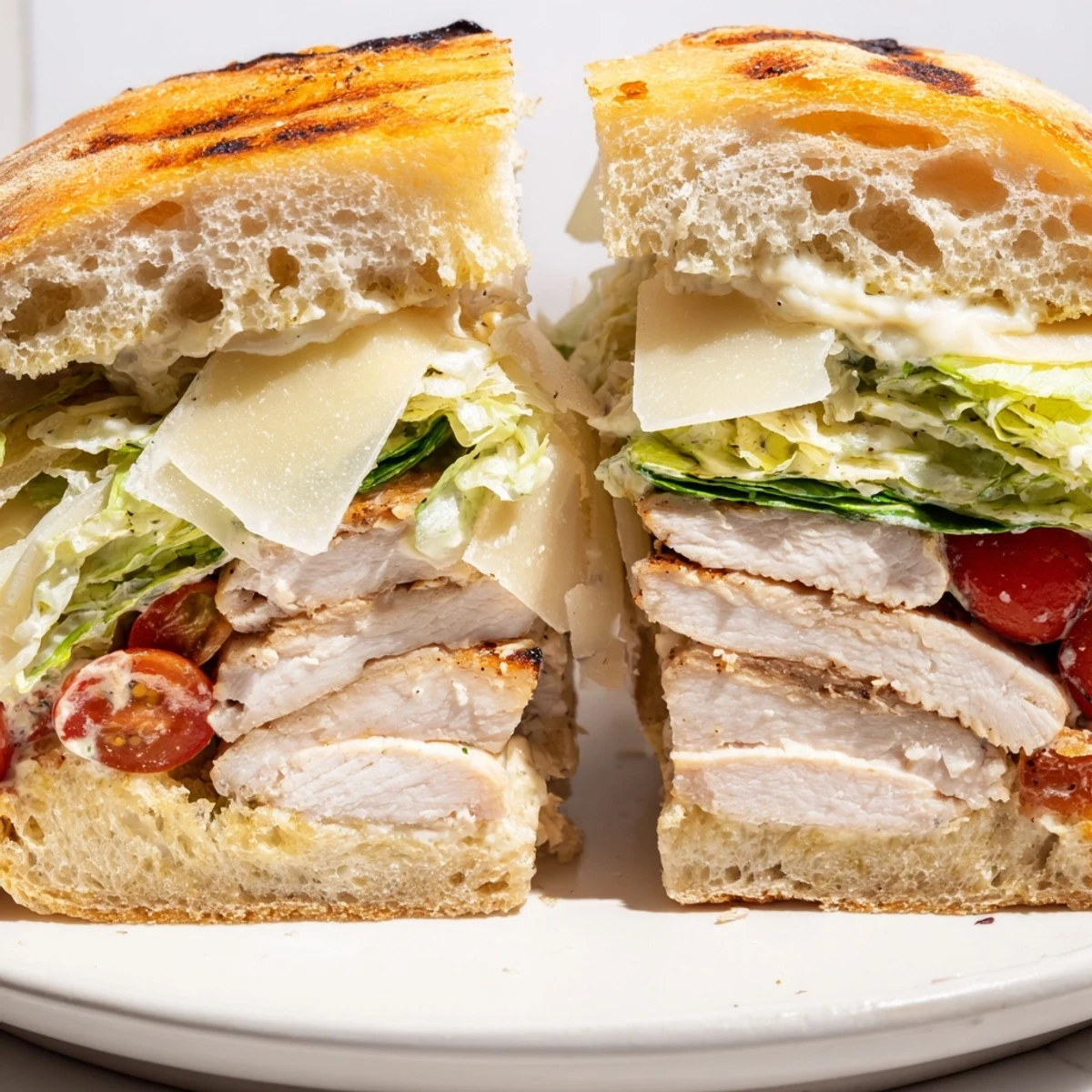 This satisfying handheld brings together tender grilled chicken breasts seasoned with garlic and black pepper, paired with a rich homemade Caesar dressing featuring mayonnaise, Parmesan, lemon, and Worcestershire. The assembly layers shredded romaine, sliced chicken, and additional shaved Parmesan on golden toasted ciabatta rolls for that perfect crunch. Optional cherry tomatoes add brightness, while the buttered and toasted buns provide structural integrity. The entire preparation comes together in just 30 minutes, making it ideal for quick lunches or casual dinners. Substitute rotisserie chicken for even faster preparation, or add crispy bacon and avocado for extra indulgence.