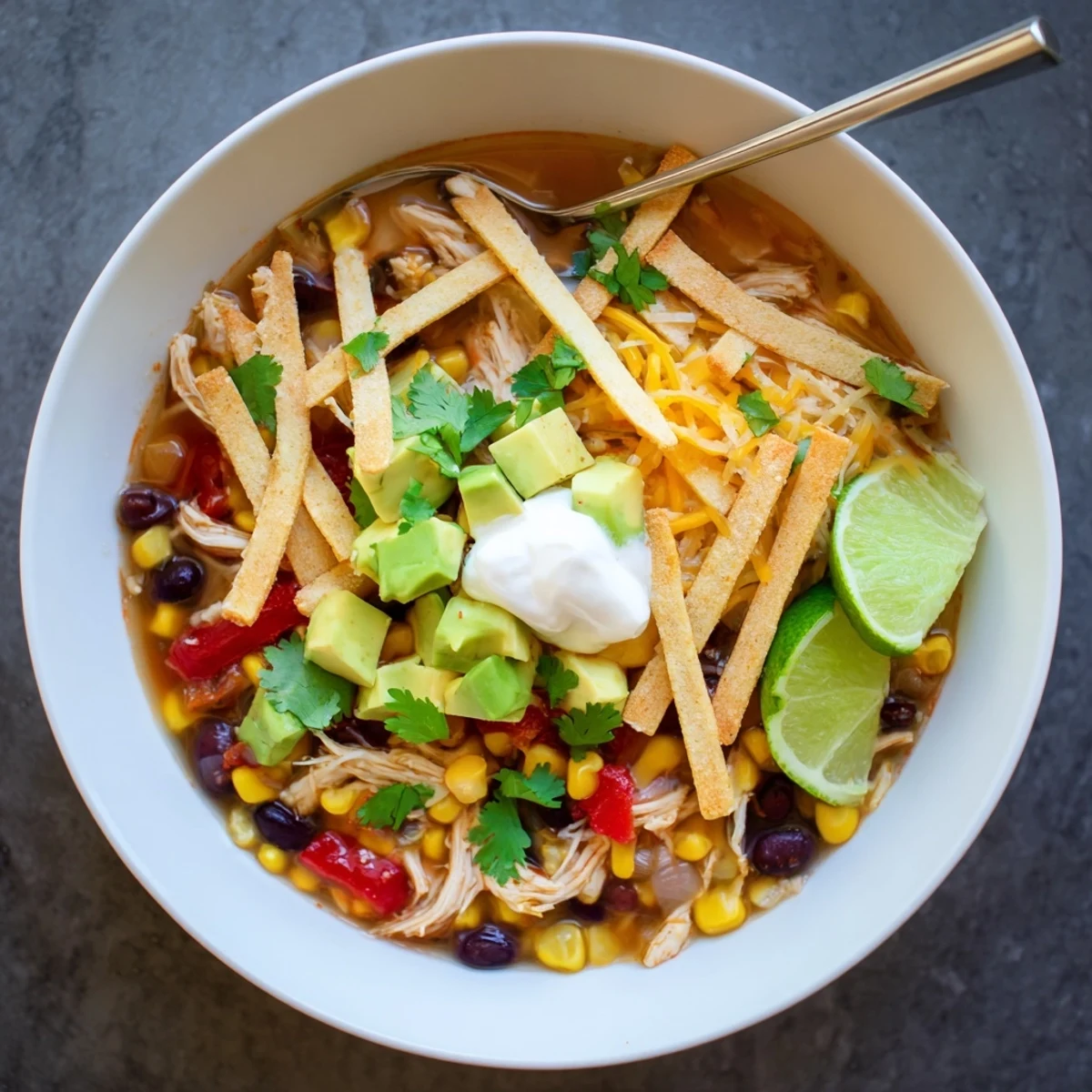 - Ladle the hot soup into bowls and pile on those crispy tortilla strips. Top with avocado, cilantro, a squeeze of fresh lime, cheese, and a dollop of sour cream.