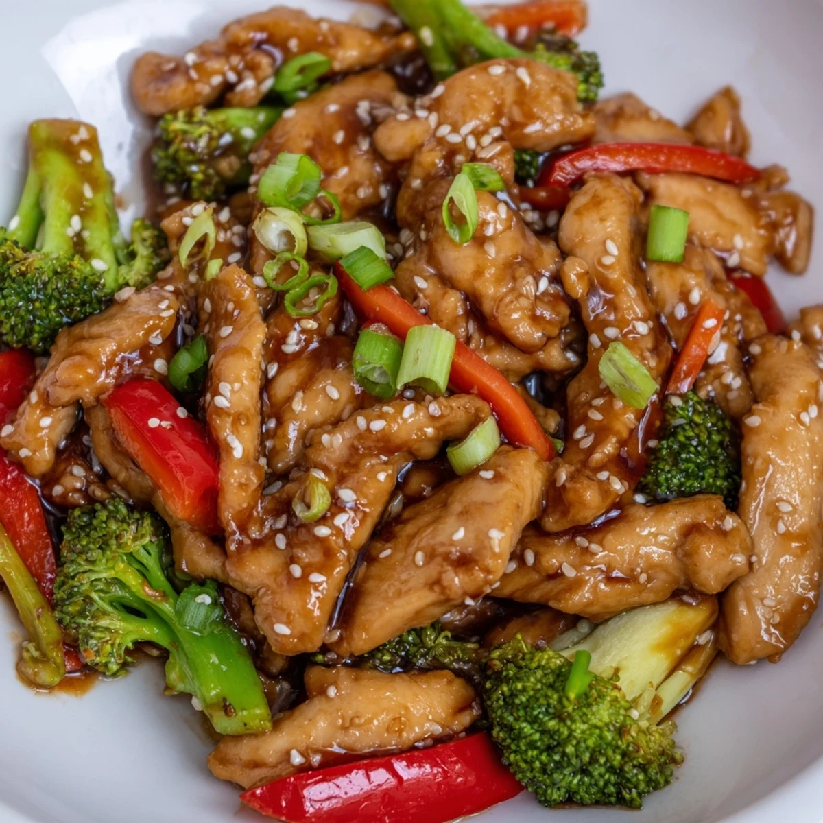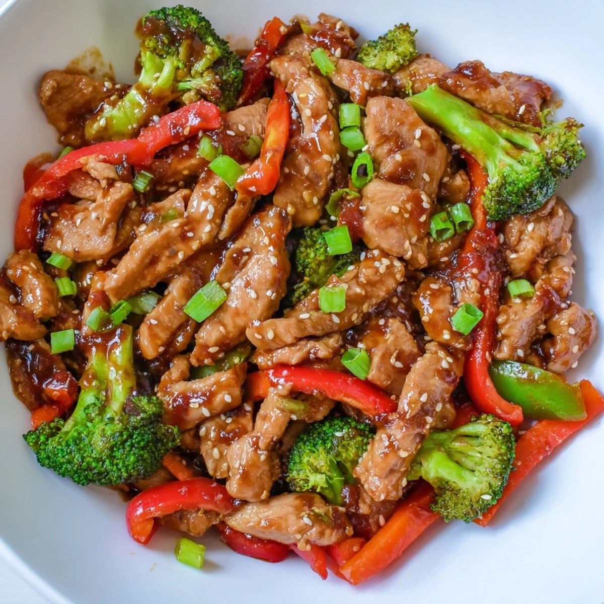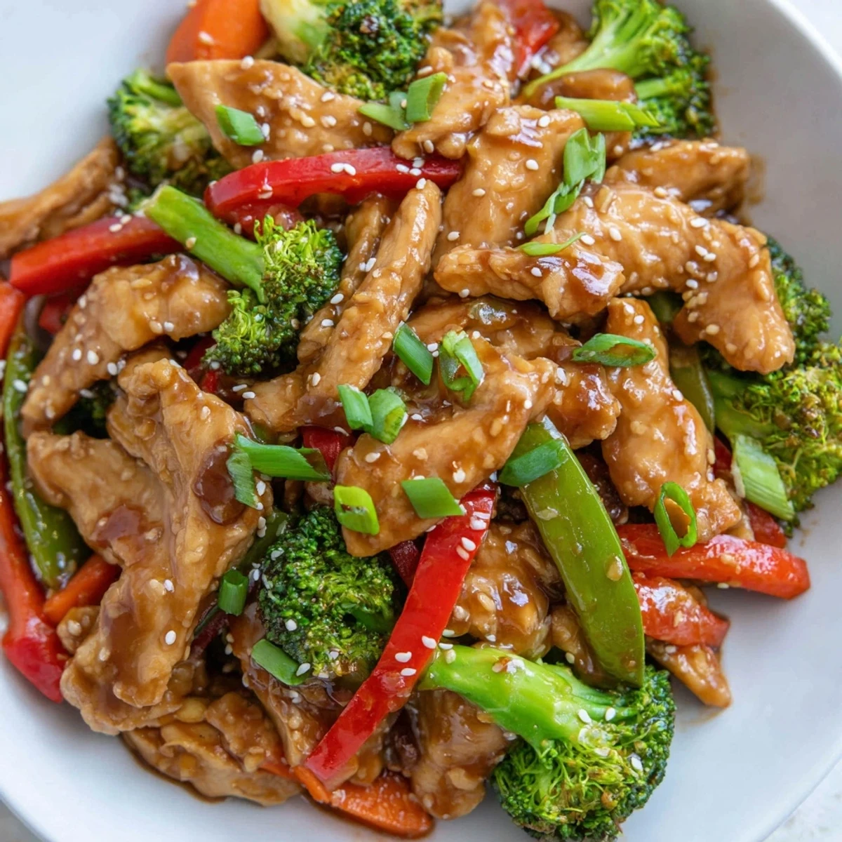 This vibrant Asian-inspired dish combines thinly sliced chicken breast with colorful vegetables like red bell pepper, broccoli, and snap peas. The star is the homemade sesame-soy sauce, blending savory soy sauce with nutty sesame oil, honey, rice vinegar, and optional sriracha for heat.